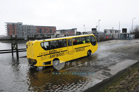 中国客车英文网[www.chinabuses.org]:荷兰公司Dutch Amfibious Transport of Rotterdam 研发了一种水陆两用客车,能坐50名乘客。近日,该客车由英国公交公司Stagecoach在位于伦弗鲁(Renfrew)和约克(Yoker)之间的克莱德河上进行测试,可以在此地取代将于2010年3月停止使用的轮渡服务。