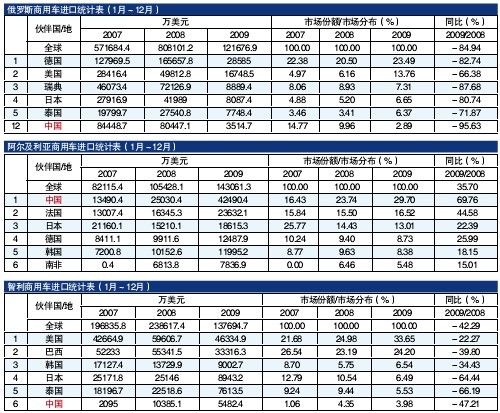 根据GTA2009年1~12月统计数据,俄罗斯在商用车进口方面的贸易伙伴有45个国家(地区),我国是其中之一。2009年,俄罗斯商用车进口极大萎缩,进口金额从2008年的80.8亿美元滑落到12.16亿美元,同比下降84.94%。主要贸易伙伴国是德国、美国、瑞典、日本、泰国等,俄罗斯从这些国家进口金额同比减少分别为82.74%、66.38%、87.68%、80.74%和71.87%。