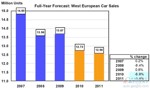 J.D. Power预计,今年接下来的月份西欧汽车市场仍将保持下滑趋势,2010年全年下滑幅度预计在7%左右,销量为1273万辆。同时,该机构还预计2011年西欧汽车市场将在2010年的基础上再下滑1.4%,销量为1256万辆。