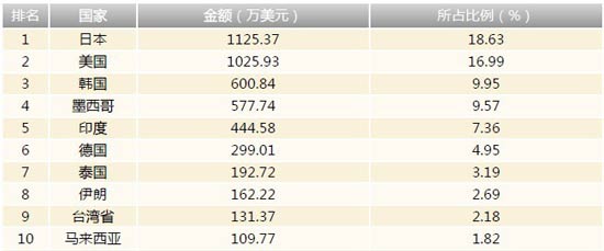 中国客车英文网[www.chinabuses.org]: 2010年我国汽车零部件-转向系统零配件出口统计,如下,主要出口国家为日本、美国、墨西哥、韩国、印度等。2010年1-8月份,转向系统零配件累计出口金额4.38亿美元,比去年同期增长59.73%。