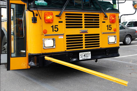 校车前方的光色障碍在停车时展开,以保证学生不会从前方驾驶室的盲区通过。