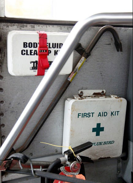 每辆校车均配备了急救包、灭火器,以及用于紧急情况发生时砸破玻璃逃生的工具。