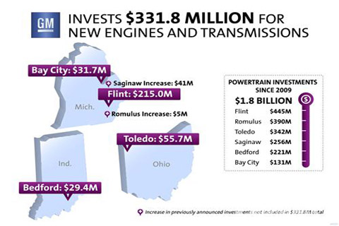 通用汽车将在美国密歇根州弗林特(Flint)工厂、贝城(Bay City)工厂、俄亥俄州托莱多(Toledo)工厂和印第安纳州贝德福德(Bedford)工厂总计投资3.318亿美元,制造一款新型Ecotec小型汽油发动机、一款新V6发动机、新八速变速箱和现有的六速变速箱。
