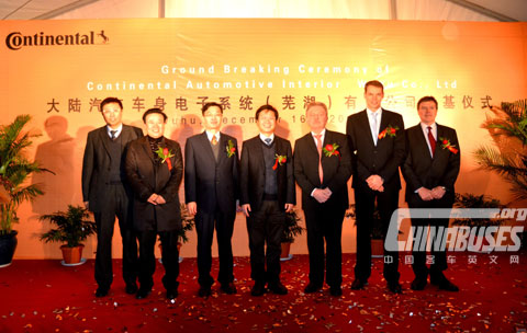 中国客车英文网【www.chinabuses.org】:2013年12月16日,中国上海讯。在当地政府官员的共同见证下,全球领先的汽车零部件供应商大陆集团在芜湖为其第二个汽车电子制造工厂举行破土动工仪式。芜湖新厂初期投资额3,300万欧元用于土地和厂房的建造,坐落于芜湖经济技术开发区内,与现有工厂相距10公里,总占地面积120, 000平方米,首期车间面积46,000平方米。新厂将包含生产运营部、研发中心、实验室及仓库,主要为仪表与人机界面业务单元服务。工厂的建设已于2013年第三季度启动,预计投产时间为2015年第一季度。