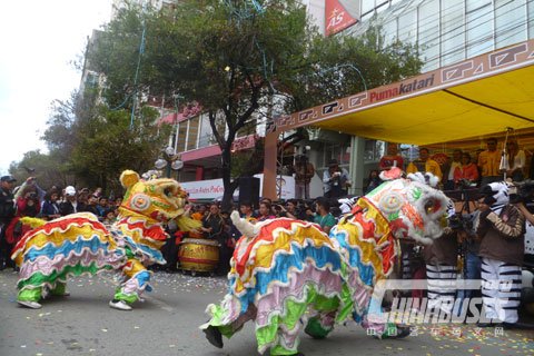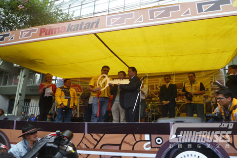 在拉巴斯市长致辞后, Ernesto和大金龙海外营销部拉美区经理马艾民,一起将金钥匙交给了拉巴斯市长,随后,现场锣鼓喧天,并有中国传统舞狮表演助兴。