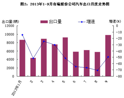 (一)奇瑞汽车出口下滑明显,但“奇瑞系”企业合计出口仍领先全国。从2013年的出口形势来看,奇瑞汽车出口已连续9个月出现下降(见图2),且下降幅度呈不断扩大的趋势,全年整体发展形势不容乐观。与同行比,前3季度,吉利出口汽车8.2万辆,同比增加23.7%,金额5.8亿美元,增长28.9%。吉利汽车出口数量和金额都超过奇瑞,奇瑞长期稳居出口销量第一名的情况已被超越。奇瑞汽车出口下降的主要原因是对亚洲和欧洲出口国家的全面萎缩。前3季度,奇瑞汽车对第1大市场伊朗出口汽车1.4万辆,减少61.4%;对伊拉克出口0.5万辆,下降71.9%;对俄罗斯出口1.3万辆,减少23.4%;对乌克兰出口0.3万辆,减少72.9%。