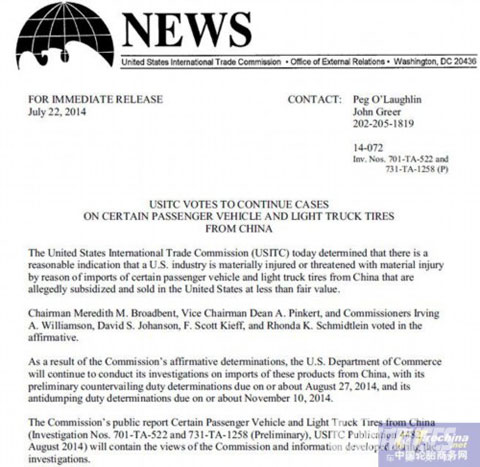 于2014年7月22日,美国国际贸易委员会决定从中国进口的轿车和轻卡轮胎可能会或可能很快会“实质性”损害美国国内轮胎行业。