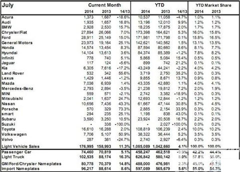 今年前七个月中,加拿大市场轻型车销量总计达到了1,085,089辆,去年同期销量为1,042,660辆,同比增长了4.1%。