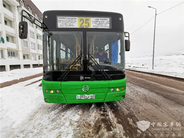 在车辆结构上,金旅从高起点出发,对标欧洲标准,实现三门全低地板公交车设计。针对哈萨克斯坦高寒极端气候地域特性,不断打磨车辆的“抗高寒”体质及耐腐蚀性。在车辆运行里程上,金旅精益求精,对整车动力性匹配等进行深入优化,不断提高车辆能耗利用率,提升车辆续航里程,以应对天寒地冻下车辆耗气量大等运营挑战。不仅如此,为确保极端冰天雪地气候下,车辆的安全性、可靠性以及车辆节能性能等也能达到最佳状态,依托金旅国家级试验中心,金旅提前投产了一台整车用于各项严苛的可靠性试验,针对高寒低温试验更是做了一轮又一轮的零下三十五度环境仓试验,充分体现了金旅对客户负责态度。
