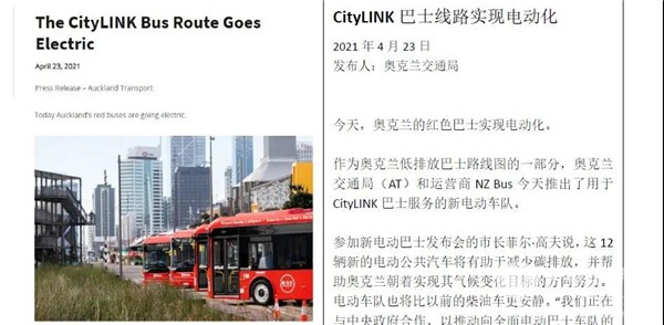 奥克兰交通局官方推特发文称:“奥克兰的红色大巴正在电动化!这是奥克兰低排放巴士路线的一部分,今天与我们的运营商NZ Bus 一起,我们为CityLINK 巴士服务推出了新的电动车队。”