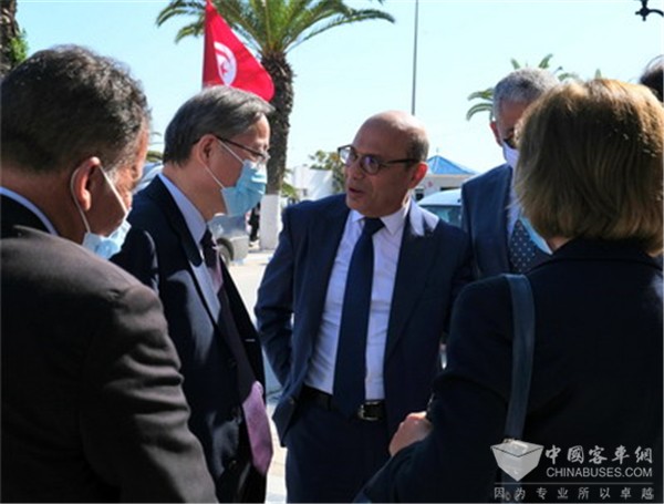 2021年10月29日下午,由突尼斯祖瓦里集团组装的首辆金龙客车在该集团位于苏斯的厂区成功下线,张建国大使同祖瓦里集团创始人兼总裁哈菲兹、企业及媒体代表等出席有关庆祝活动。