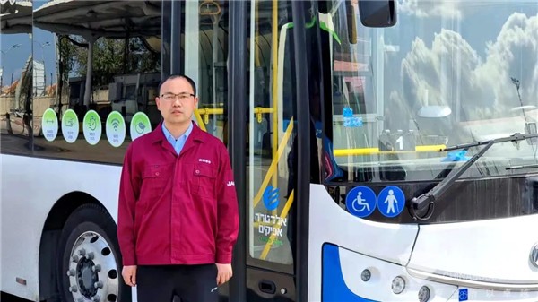 为了保障该批车辆的顺利试运营,王爱林担当起了“护车使者”。由于这批G9纯电动客车配置比较高,配有电子制动、车身电控升降、车道偏离预警、CAN系统、电驱桥、智能监控等系统,加上这是当地首次接触纯电动客车,所以客户需要重新认知学习。负责以色列项目的王爱林为了让客户安心,除了先期持续提供远程在线技术支持外,毅然决定在疫情形势严峻时逆行前往以色列,实地跟踪车辆运营情况,协助用户解决试运营过程中遇到的问题。