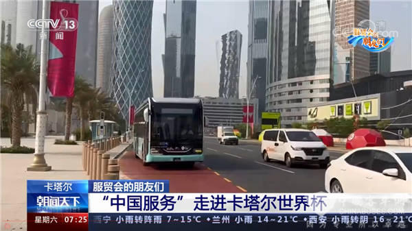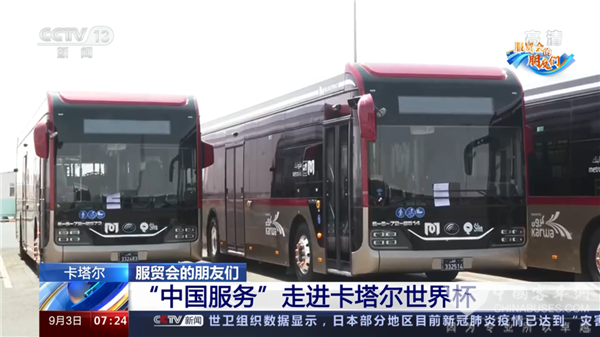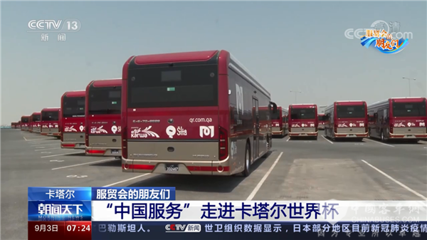 2022年中国国际服务贸易交易会正在北京举行。9月3日,CCTV央视《朝闻天下》以“中国服务”走进卡塔尔世界杯为题,对中国企业为2022卡塔尔世界杯提供服务进行了专题报道。报道中指出,在卡塔尔世界杯筹备过程中,卡塔尔专门组建了一支由700多台纯电动客车组成的新能源车队,负责世界杯期间的球迷接驳任务,而这些纯电动客车全部来自中国的宇通客车公司。
