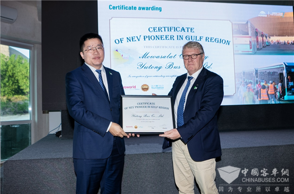 随着全球碳达峰、碳中和目标的推进,各国、各地区、各大企业展开内涵丰富、成果显著的务实合作。在世界杯举办同期,以“共创绿色 低碳未来”为主题的宇通新能源发展论坛在卡塔尔多哈召开。Busworld学术委员会主席JAN RICHARD K DEMAN,对宇通Mowasalat在卡塔尔公共交通电动化过程中的卓越贡献给予了高度赞扬,特代表Busworld表彰宇通客车、Mowasalat为 “新能源绿色先锋”。