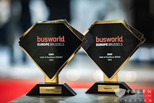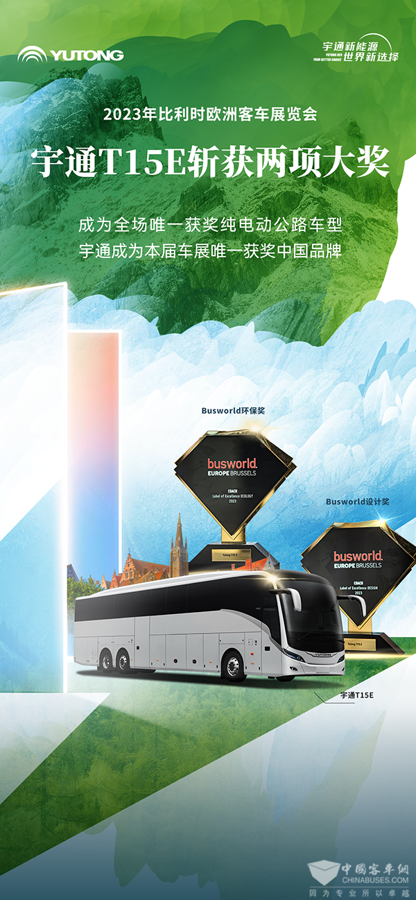 当地时间2023年10月7日,2023年比利时欧洲客车展览会在首都布鲁塞尔开幕。开幕首日,宇通T15E高端豪华纯电动公路客车荣获“busworld设计奖”和“busworld环保奖”双料大奖,是全场唯一获奖的纯电动公路车型,该奖项从外观设计、技术创新、环保等多个维度进行综合评定产生,宇通也成为本届车展中唯一获奖的中国品牌!