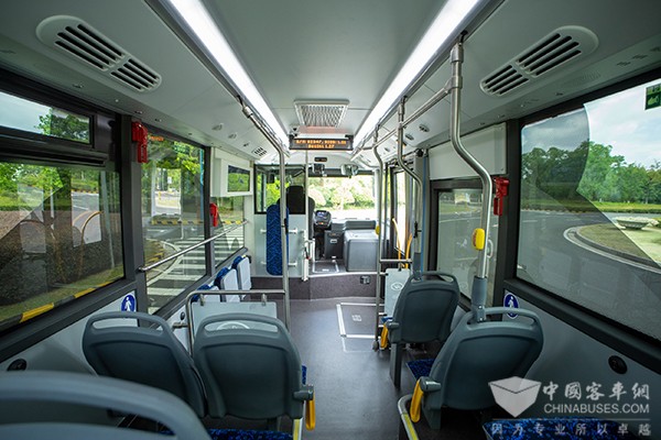 进入车辆内部,外观“迷你”的Azure 7却很有内秀。车内采用独立驾驶区,配备独立表头,操纵舒适便捷;乘客区也充分体现了海格客车的人性化设计,平整大面积的低地板区提供了可观的站立空间,最大载客量可达40人,并且可满足无障碍、快速上下车需求;座椅布置可根据客户需求定制化设计,满足不同线路的差异化需求。