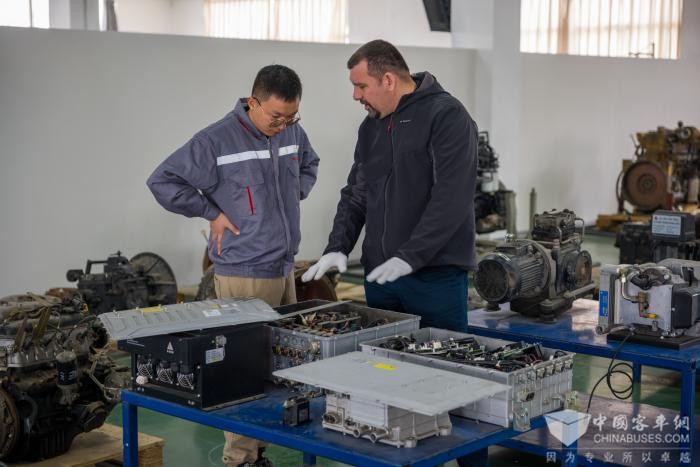 Ivan Palurovic和Vekoslav Ilic是苏州金龙在塞尔维亚的属地化员工。两人分别于2019年和2022年加入海格塞尔维亚售后服务团队,除了常规化的线上培训之外,2023年两人还应邀来中国开展为期2周的专项培训,培训内容包括海格企业文化、新能源及常规车技术培训、实车故障排查等,确保提升外籍员工技术能力的同时,让他们感受到公司的人文关怀,加强文化认同归属感。2023年3月,他们和其他来自世界各地的外籍员工陆续抵达中国,参加了为期半个月的培训。培训共分为两部分,第一周为技术培训,从基础的电气原理、线束图教学,到CAN网络,涵盖苏州金龙各类产品系列;同时针对海外新能源市场快速扩张的市场现状,苏州金龙还为Ivan等服务人员专门安排了新能源系统相关课程,让外籍员工进一步熟悉和了解新能源车辆故障处理流程及技巧。培训过程中,学员与讲师相互讨论,相互提问,在实车上发现、解决问题,学习知识技能。培训结束后员工们还接受了相应的理论和实操考试,帮助学员巩固新知识。在第二周的培训中,外籍员工们参观了苏州金龙工厂,了解了公司发展历史,在提升知识水平的同时,也分享了精益生产、售后服务等工作的重点难点,为后续苏州金龙全球化服务的开展打下坚实基础。