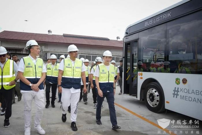 棉兰市长Bobby Nasution(前排右二)参观海格纯电公交