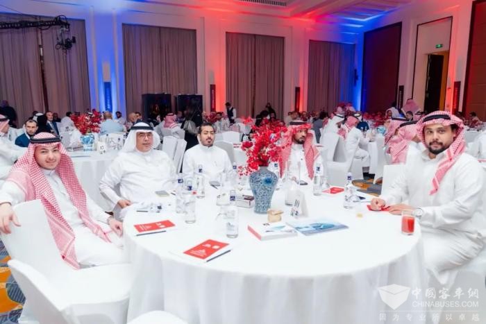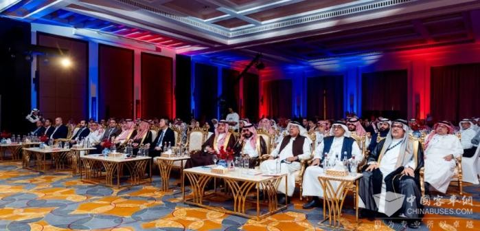 金龙董事长侯晨磊、沙特NTC董事长Dr.Hamed先生、中东200多位客户伙伴以及沙特交通局、朝觐署、标准局、海关、吉达商会等人员齐聚庆典现场,共同见证这一历史性时刻。