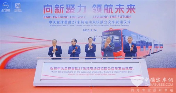 在各位领导精彩的致辞之后,活动进入了最为激动人心的环节——车辆发运启动仪式。随着启动杆向下推动,申沃全球首款27米纯电动双铰接公交车缓缓驶向运输船只,现场响起了热烈的掌声和欢呼声。随着全球公共交通行业的绿色化、智能化发展,新能源客车市场势必将迎来更加广阔的发展空间。申沃客车也将继续坚持创新驱动,不断提升产品和服务,满足全球客户的多样化需求。同时,申沃客车也将继续在上汽集团的统筹部署和全力支持下,持续深化与上汽国际以及上汽商用车国际在海外出口市场的合作,共同推动上汽大客车的扬帆出海。