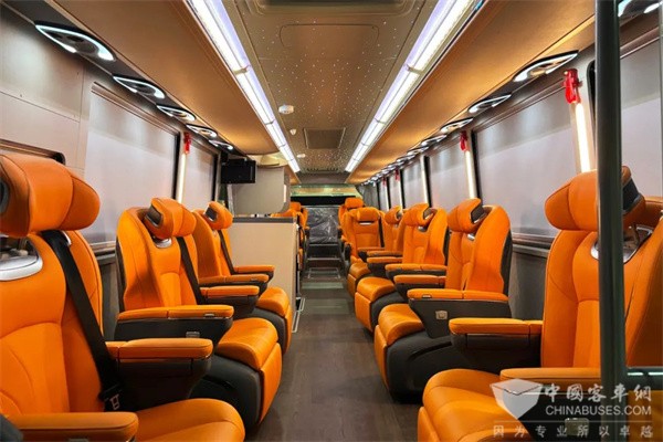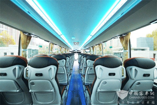 在内饰设计上,宇通采用高端真皮拼色座椅,兼具座椅通风、加热、旋转、升降功能;配合星空光纤顶灯、动车窗帘、窗立柱氛围灯,营造出沉稳而尊贵的舱内氛围。