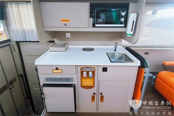 前瞻考虑特别场景下临时会务或长途接待的多元化需求,设计了多功能商务吧台,集成冰箱、饮水机、水槽、储物吊柜、微波炉等实用配置;且搭载了智能供电系统,满足移动办公设备随时可接电使用的高效行程体验。