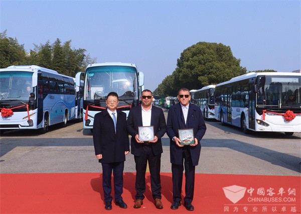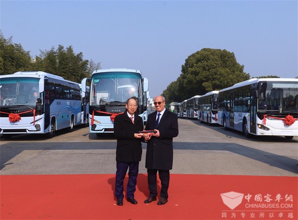 苏州金龙总经理黄书平(左)向阿方使馆代表赠送新V系车模