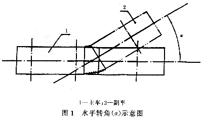 在通过球心且平行于支承平面的平面内,以通过球心的主车纵向水平线为基准,副车绕球头销轴线回绕所形成的角度(图1)。