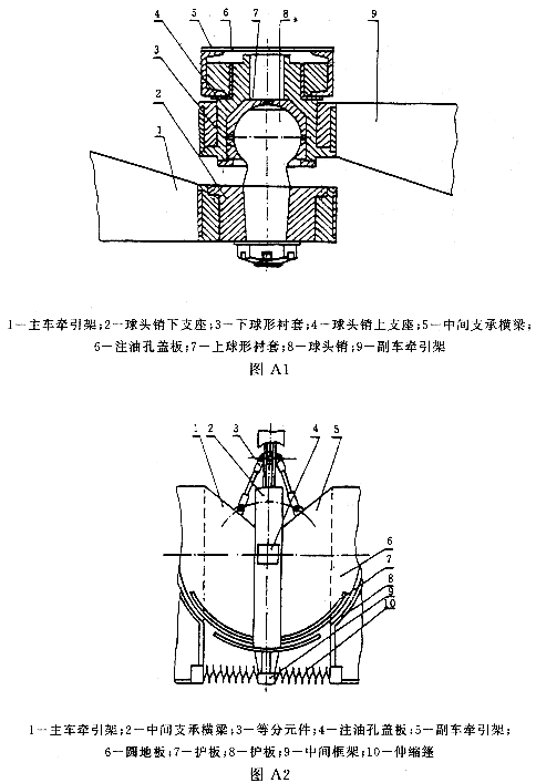 在球铰式机械连接装置中,能满足主车1)和副车2)可靠的连接功能,并且有三个转动自由度的机构。它主要由球头销、球形衬套及支座等零件组成。