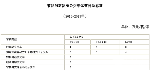 为加快新能源公交车替换燃油公交车步伐,2015-2019年期间中央财政对达到新能源公交车推广目标的省份,对纳入工业和信息化部“新能源汽车推广应用工程推荐车型目录”、年运营里程不低于3万公里(含3万公里)的新能源公交车以及非插电式混合动力公交车,按照其实际推广数量给予运营补助。具体标准见附件。2020年以后再综合考虑产业发展、成本变化及优惠电价等因素调整运营补助政策。