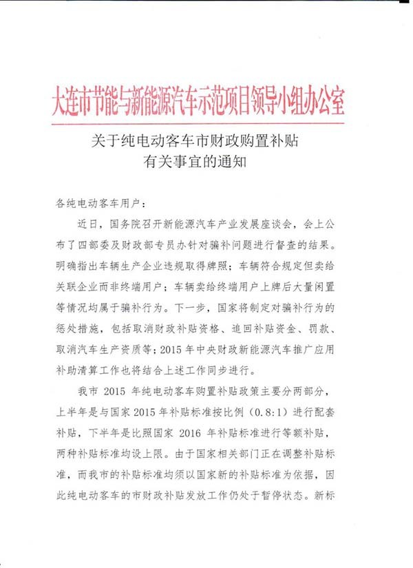 大连市发布《关于纯电动客车市财政购置补贴有关事宜的通知 》