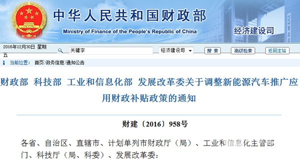 四部委关于调整新能源汽车推广应用财政补贴政策的通知