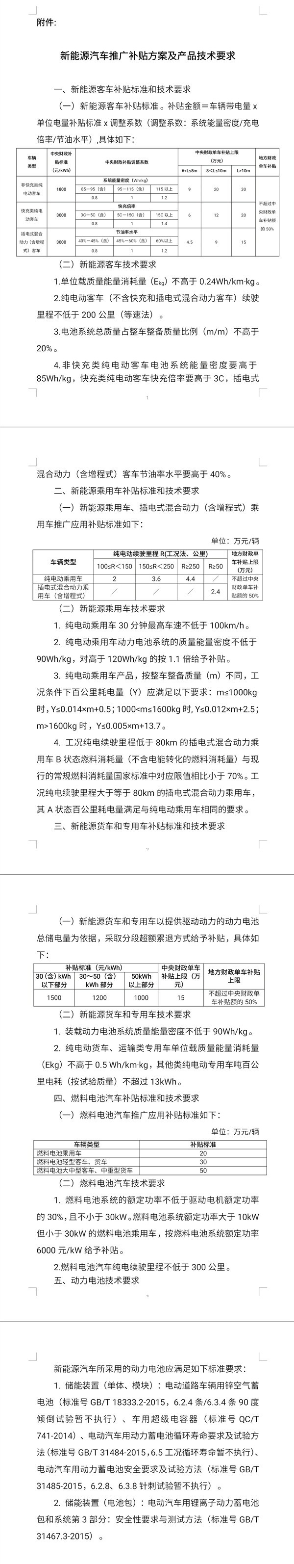 (二)在保持2016-2020年补贴政策总体稳定的前提下,调整新能源汽车补贴标准。对新能源客车,以动力电池为补贴核心,以电池的生产成本和技术进步水平为核算依据,设定能耗水平、车辆续驶里程、电池/整车重量比重、电池性能水平等补贴准入门槛,并综合考虑电池容量大小、能量密度水平、充电倍率、节油率等因素确定车辆补贴标准。进一步完善新能源货车和专用车补贴标准,按提供驱动动力的电池电量分档累退方式核定。同时,分别设置中央和地方补贴上限,其中地方财政补贴(地方各级财政补贴总和)不得超过中央财政单车补贴额的50%(详细方案附后)。除燃料电池汽车外,各类车型2019-2020年中央及地方补贴标准和上限,在现行标准基础上退坡20%。同时,有关部委将根据新能源汽车技术进步、产业发展、推广应用规模等因素,不断调整完善。
