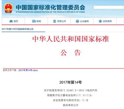 公告名称:关于批准发布GB/T 31467.3-2015《电动汽车用锂离子动力蓄电池包和系统 第3部分:安全性要求与测试方法》第1号修改单的公告