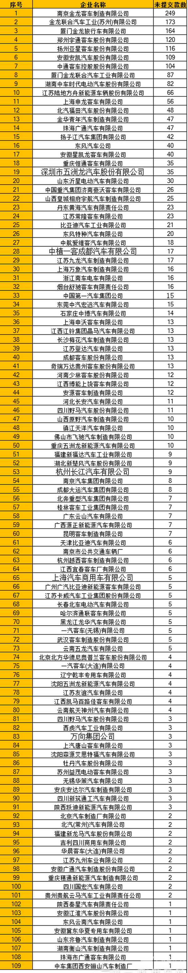 根据统计发现,此次共涉及109家新能源客车企业,几乎所有国内的新能源客车生产企业都中招。100辆以上车型公告被暂停的企业多达7家。南京金龙最多,249款车型公告被暂停,苏州金龙有173款车型公告被暂停,厦门金旅164款车型公告被暂停。宇通客车120款车型公告被暂停。扬州亚星客车116款车型公告被暂停。安凯客车109款车型公告被暂停。中通客车104款车型公告被暂停。