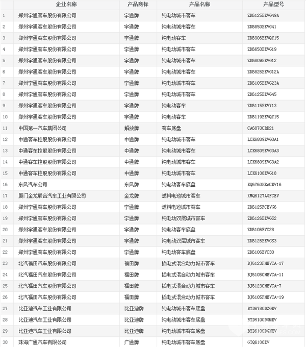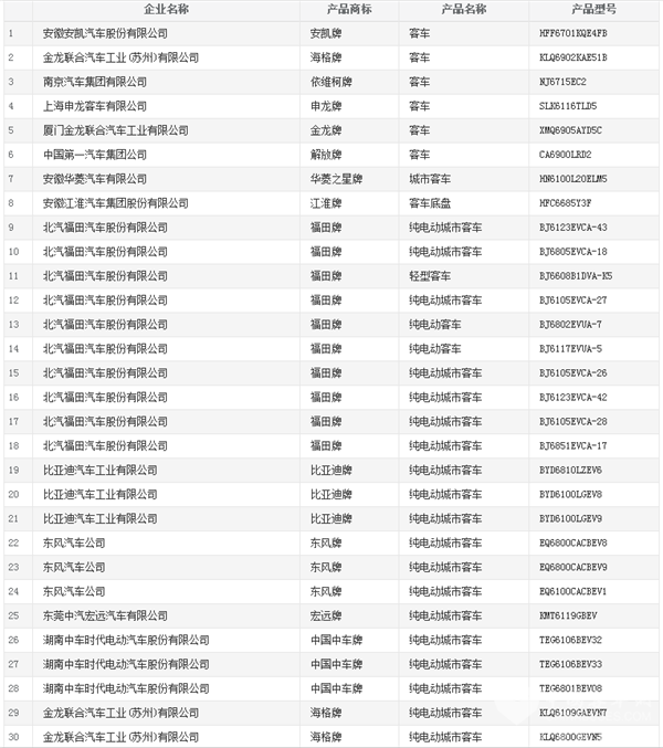 XINGKONG.COM了解到,宇通客车、福田汽车、比亚迪、东风汽车、中通客车、金龙客车、金旅客车、申龙客车、中车电动、苏州金龙等都有多款客车产品入围,其中宇通客车累计有25款新能源客车上榜,位列榜首;福田汽车共有14款客车产品上榜,包括13款新能源客车和1款轻型客车,位列第二;比亚迪有6款纯电动客车入围,位列第三。