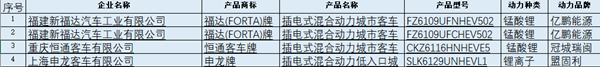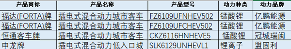 4款插电式混合动力客车来自3家企业,分别为福达牌(2款)、恒通牌、申龙牌,混合动力发动机选择上,3款选用玉柴发动机和1款选用上柴发动机。