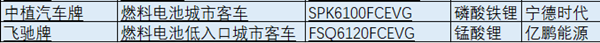 本批申报客车中,仅有两款燃料电池客车申报,分别来自中植客车和佛山飞驰客车。中植SPK6100FCEVG燃料电池城市客车搭载宁德时代磷酸铁锂电池,选用江苏清能动力科技有限公司提供的燃料电池,南京越博TZ368XS-YBM205动力系统;佛山飞驰FSQ6120FCEVG燃料电池低入口城市客车,搭载亿鹏能源锰酸锂电池,选用广东国鸿重塑能源科技有限公司提燃料电池,苏州绿控TZ410XS-LKM2501动力系统。