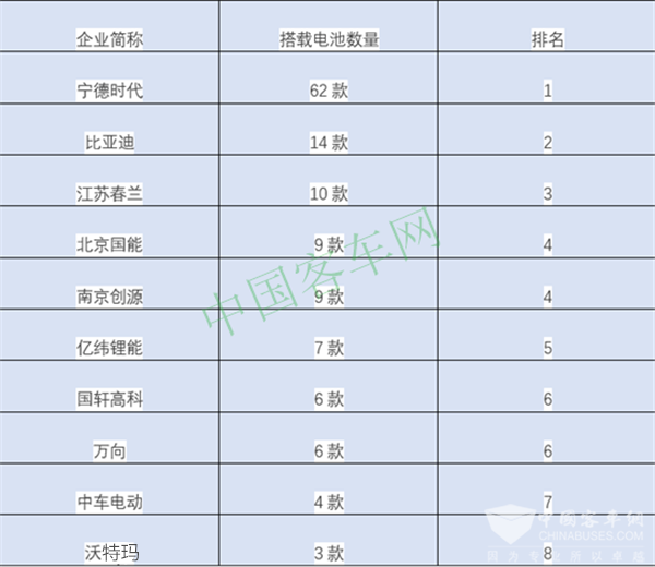 从电池品牌看,150款新能源客车中,有62款选择了宁德时代电池,12款比亚迪和2款广汽比亚迪搭载比亚迪电池,10款搭载了江苏春兰电池,9款选择了北京国能,7款搭载了亿纬锂能,6款搭载了国轩高科,9款南京金龙搭载南京创源动力(成箱后的储能装置生产企业),4款中车电动搭载的电池储能装置总成由自家提供。同时,沃特玛、微宏动力、中航锂电等电池企业为申报的新能源客车提供配套。