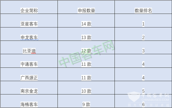 从客车品牌看,亚星客车申报14款客车,位列榜首;申龙客车申报13款客车,位列第二;比亚迪申报12款客车,位列第三;宇通客车和广西源正新能源分别申报11客车产品,位列第四;南京金龙申报10款客车,位列第五。另外,海格、南京依维柯、万向、中车电动、安凯客车、中通客车、金龙客车、金旅客车、舒驰客车、珠海银隆等都有多款产品申报。