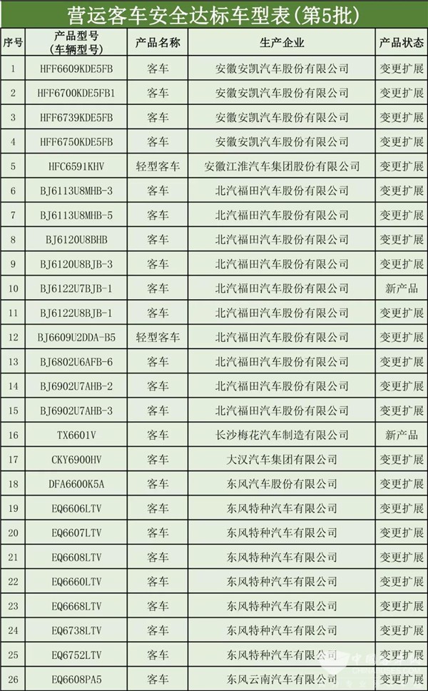 交通部公布《营运客车安全达标车型(第5批)》174款客车入选