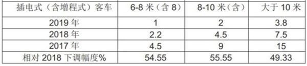 从2019年的补贴方案看,新能源补贴额度下调幅度相对2018年的补贴标准在55.55-49.33%不等。2019年不同种类的新能源客车补贴调整具体幅度见下表: