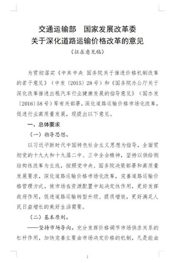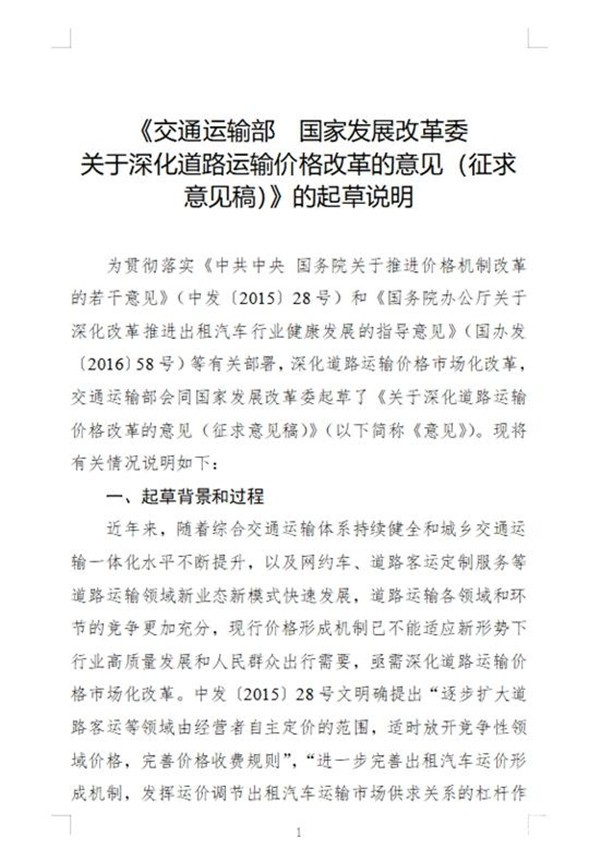 附件一:交通运输部 国家发展改革委关于深化道路运输价格改革的意见(征求意见稿)