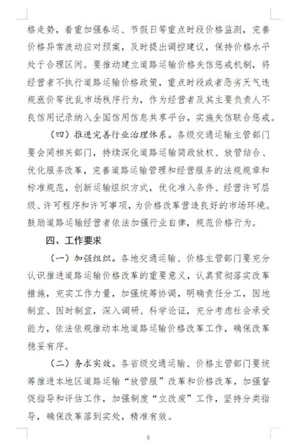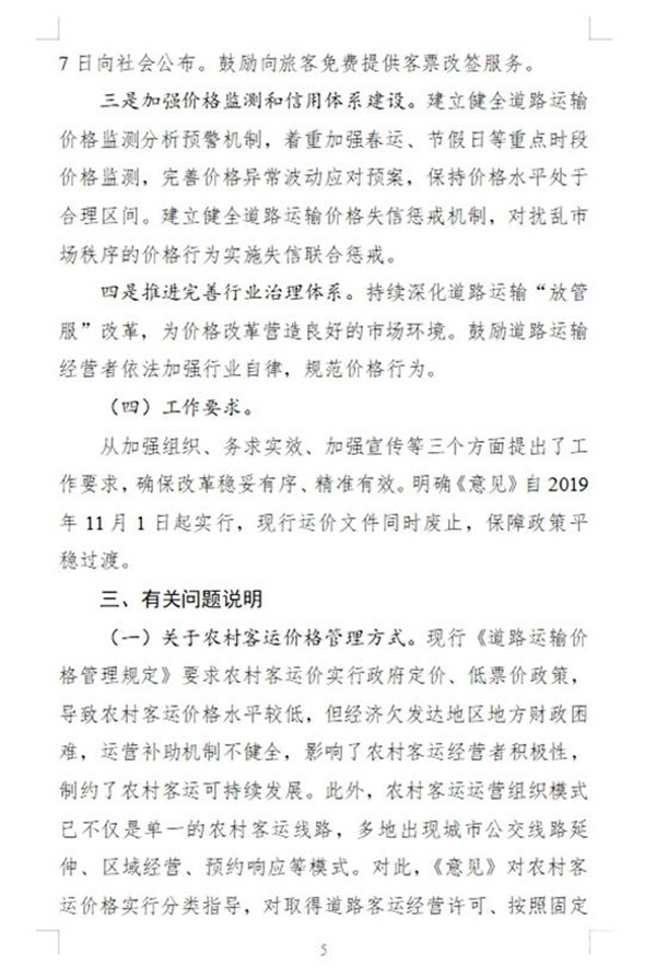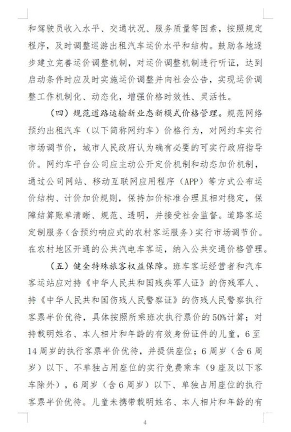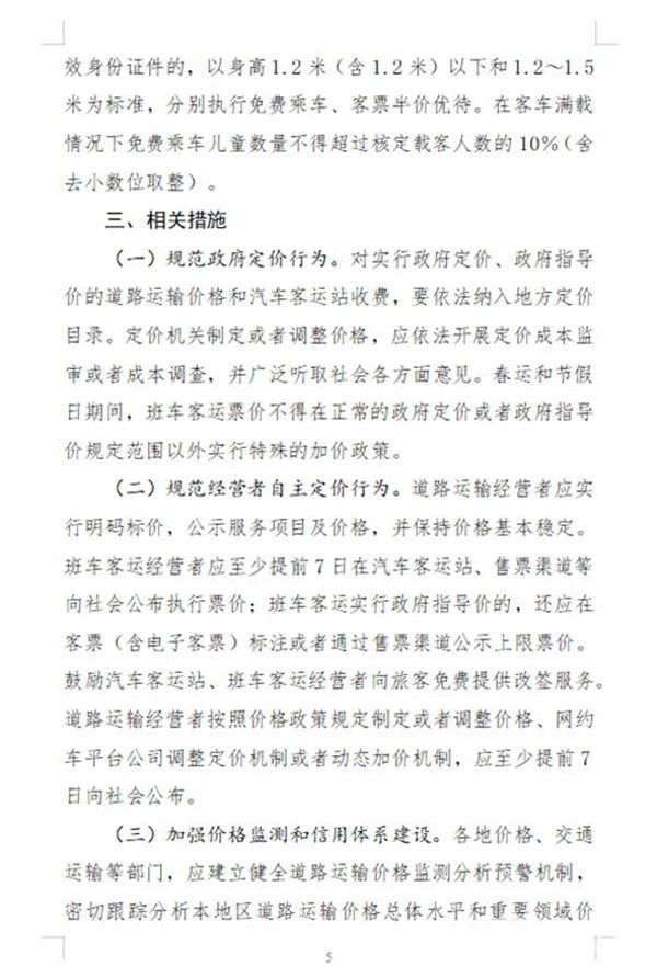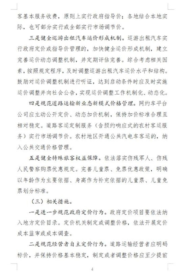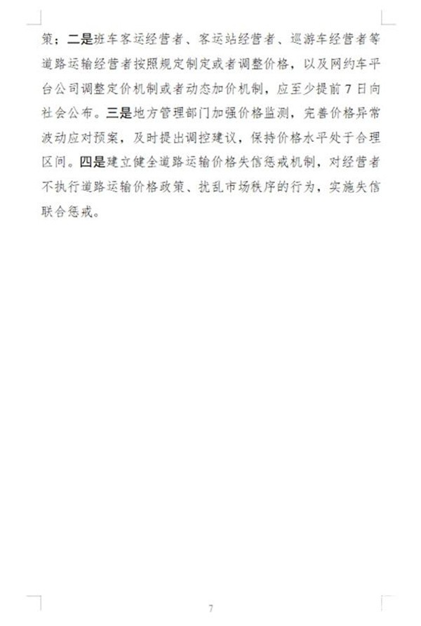 此外将进一步规范政府和经营者定价行为,道路运输经营者应明码标价,按政策制定或调整价格,并保持基本稳定。班车客运应至少提前7天公布票价,实行政府指导价的,应标注或公示上限票价,并鼓励向旅客免费提供改签服务;网约车平台公司应主动公开定价和动态加价机制,如需调整,至少提前7天向社会公布。巡游出租车、网约车、班车客运等在恶劣天气或重点时段违规涨价的,将被纳入信用“黑名单”。
