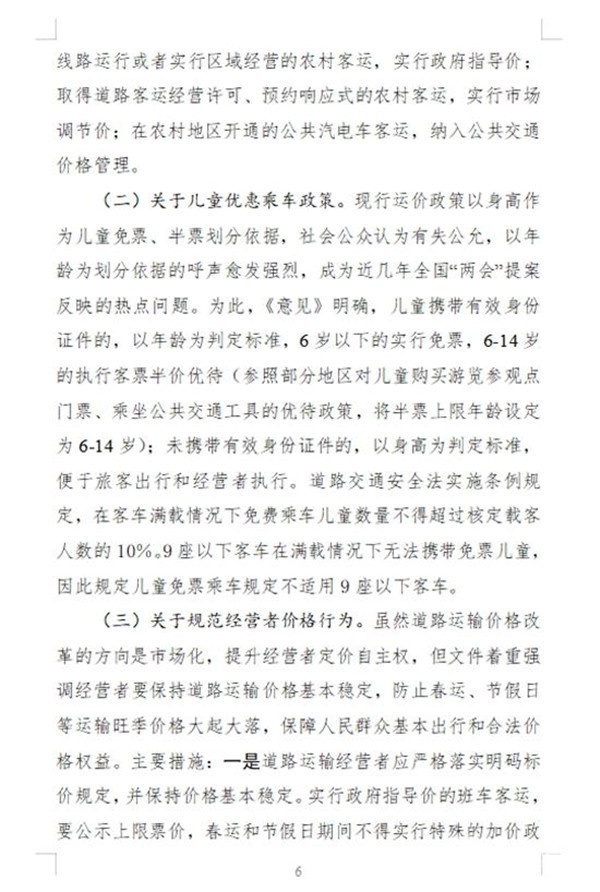 2019年7月12日,交通运输部、发改委起草了《交通运输部 国家发展改革委关于深化道路运输价格改革的意见(征求意见稿)》(以下简称《意见》),向社会公开征求意见。《意见》明确,儿童携带有效身份证件的,以年龄为判定标准,6-14岁的执行客票半价优待;未携带有效身份证件的,以身高为判定标准,便于旅客出行和经营者执行。
