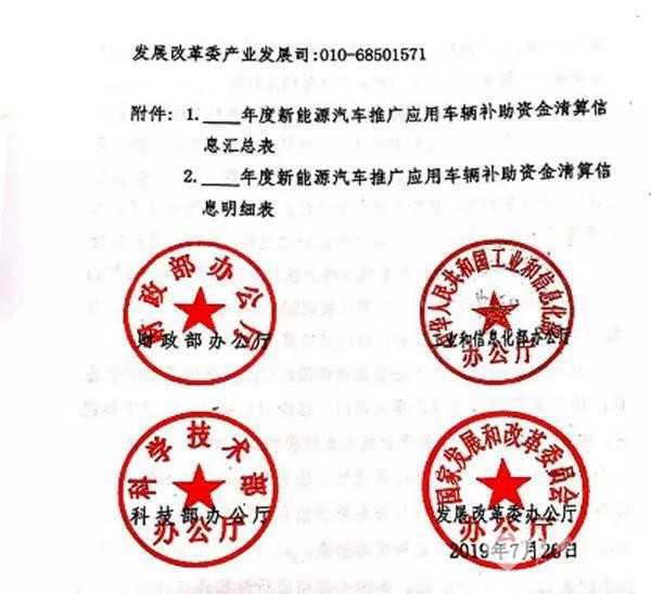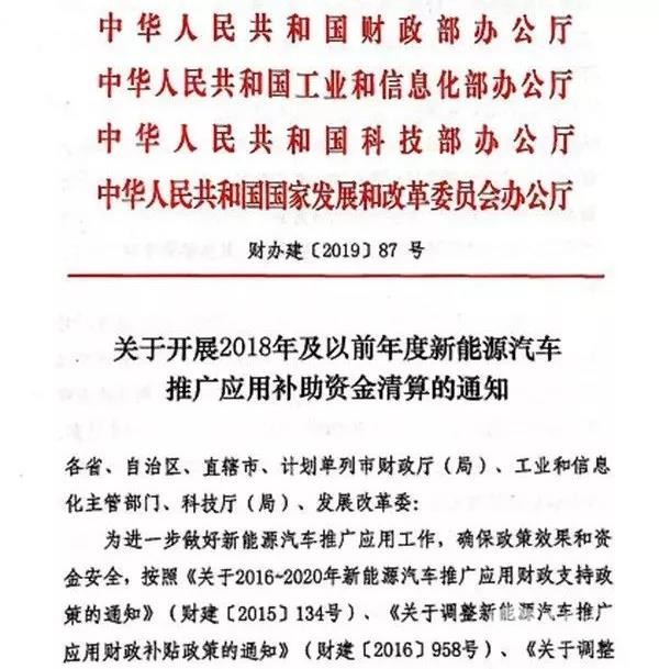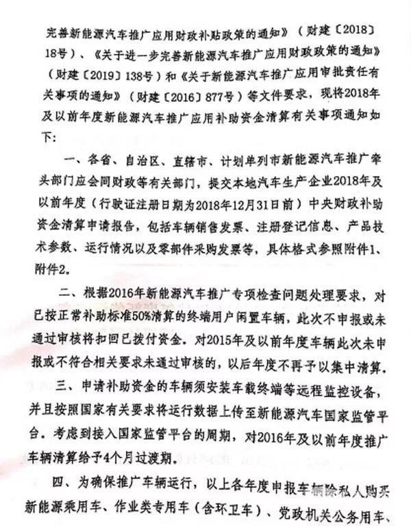 2019年7月30日,财政部、工信部、科技部、发改委联合发布了《关于开展2018年及以前年度新能源汽车推广应用补助资金清算的通知》,《通知》指出,对2016年-2018年度销售上牌、此前未获得中央财政补助的车辆,将开展报补助资金清算;对2016年度已按正常补助标准50%清算的终端用户闲置车辆,此次不申报或未通过审核将扣回已拨付资金,对2015年度及以前车辆此次未申报或不符合相关要求未通过审核的,以后年度不再予以集中清算。