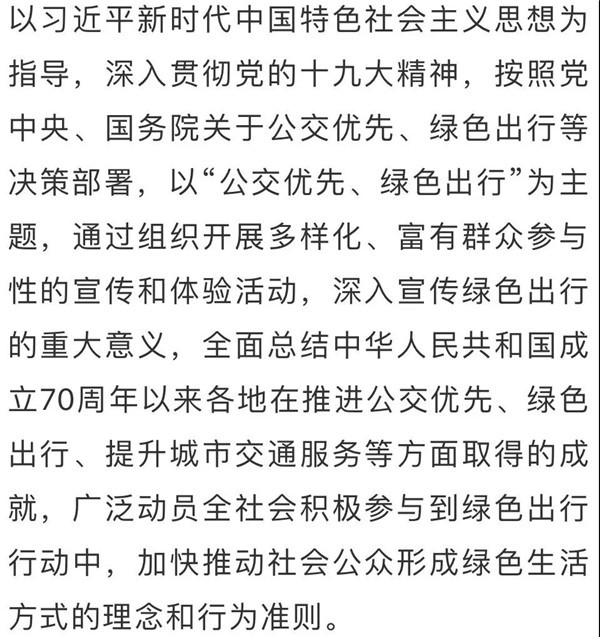 2019年8月21日,交通运输部、公安部、国管局、中华全国总工会四部门联合印发《关于组织开展2019年绿色出行宣传月和公交出行宣传周活动有关事项》的通知。
