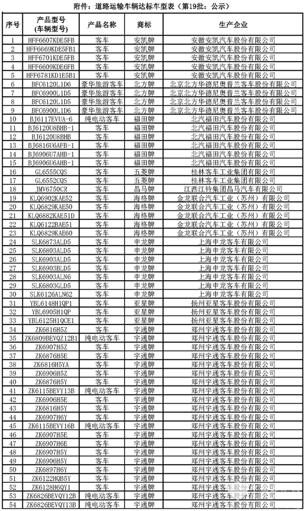附:道路运输车辆达标车型表(第19批:公示) (客车部分)