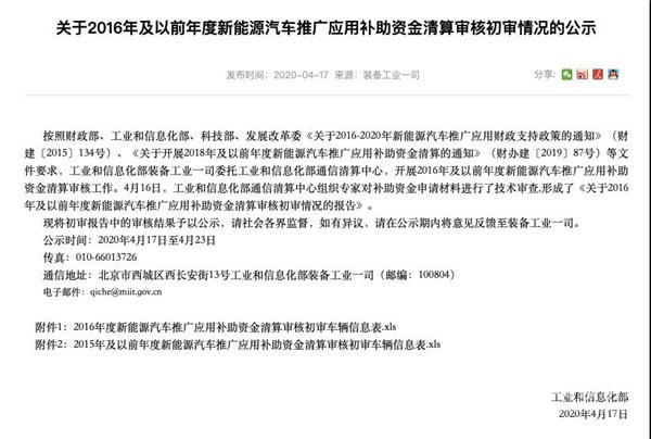 2020年4月17日,工信部发布了《关于2016年及以前年度新能源汽车推广应用补助资金清算审核初审情况的公示》。