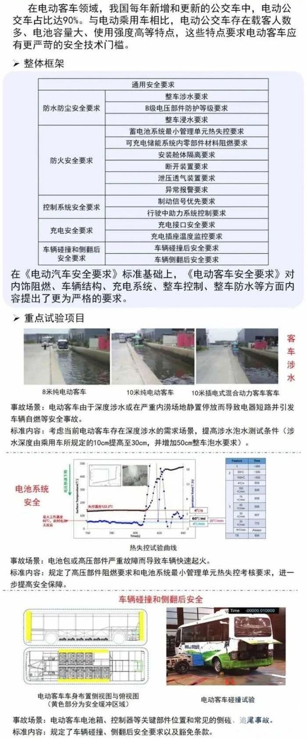 《电动客车安全要求》针对电动客车载客人数多、电池容量大、驱动功率高等特点,在《电动汽车安全要求》标准基础上,对电动客车电池仓部位碰撞、充电系统、整车防水试验条件及要求等提出了更为严格的安全要求,增加了高压部件阻燃要求和电池系统最小管理单元热失控考核要求,进一步提升电动客车火灾事故风险防范能力。